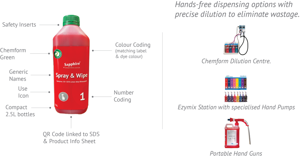 Sapphire Concentrates are part of the stringent Chemform Green range of products. Products in this range contain no oil-based hydrocarbons, chlorine, chlorinated hydrocarbons, carcinogens, alkyl phenol ethoxylates or heavy metals. Products containing detergents are readily biodegradable and all products are classified as non-dangerous according to the Dangerous Goods Code, plus much more.